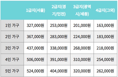 거주지마다 지원금의 차이가 있습니다. 아래의 표를 보시면 1급지인 서울, 2급지 경기,인천 3급지 광역시, 세종 4급지 그외의 지역으로 나뉘게 됩니다.