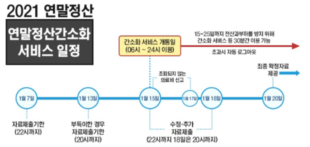 1월14일까지 홈택스에 신청한 근로자의 명단을 제출해야 간소화 서비스를 받으실 수 있습니다. 일괄적으로 제공이 되는 간소화 자료는 1월 21일 부터 홈택스 홈페이지에 다운로드가 가능하며, 2월말 까지는 회사에 소속되어있는 근로자의 연말정산 공제신청 내용 확인 후 연말정산 이행 근로자에게 원천징수 영수증 발급 및 3월10일가지 근로 소득 지급 명세서 제출이 완료가 되어야 합니다.