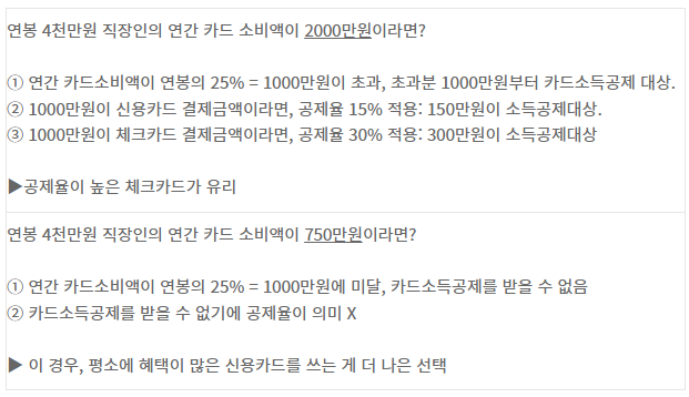예) 연봉 5천만원인 직장인의 경우 5천만원의 25%인 1250만원 이상을 카드소비를 해야 소득공제가 가능 합니다.