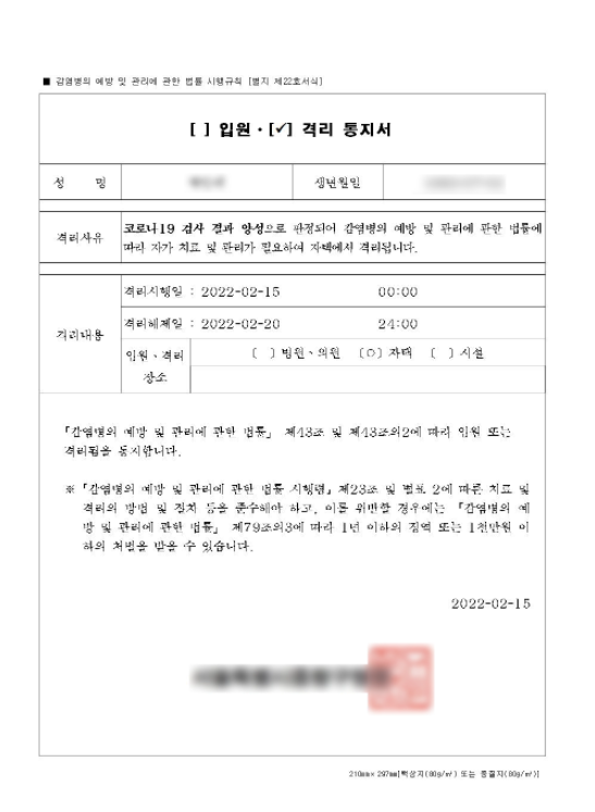 * 과거에는 통지서가 우편으로 발송이 되었습니다. 하지만 확진자의 급증으로 인해서 우편을 수령받지 못할 수도 있습니다. 하지만 격리 통지서가 오지 않았다면 연락을 취해서 카톡 혹은 무자로 격리 통지서를 받으시면 됩니다.