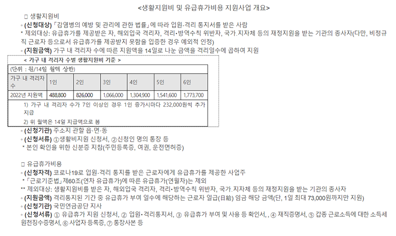 코로나 바이러스에 확진 및 밀접접촉자로 분류되어 보건소의 격리, 입원 치료 통지와 격리 해제 통지를 받은 사람 중 감염 예방법에 의한 유급휴가 비용을 지원받지 않은 사람(단, 당국의 격리조치 위반자는 제외)
