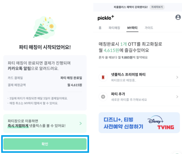 피클플러스를 이용하면 월요금 4,615원으로 넷플릭스 이용이 가능 합니다. 만약 본인이 파티장이 된다면 4000원 초반으로 도 이용이 가능한데요, 기존 요금의 30%가격으로 이용이 가능하니 꼭 한번 해보시기 바랍니다.