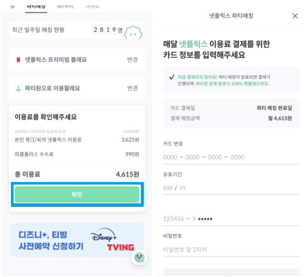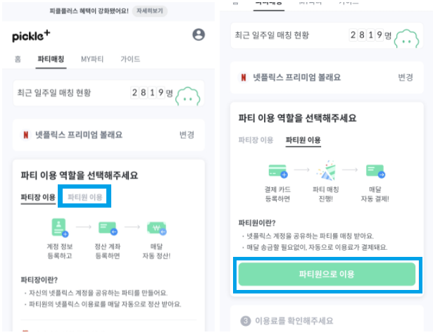 파티원은 총 4명으로 이루어지게 됩니다. 넷플릭스를 따로 가입하지 않은 상태에서 파티원으로 참가하시면 됩니다.