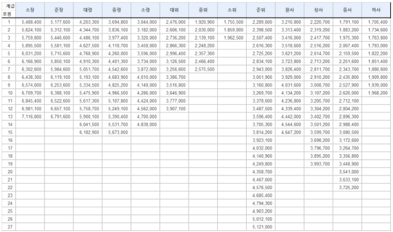 아래의 표는 군인 간부의 월급 입니다. 가장 눈에 띄는 것은 바로 준위 인데요, 준위는 27호봉 까지 어마어마한 상승 스코프를 확인하실 수 있습니다.