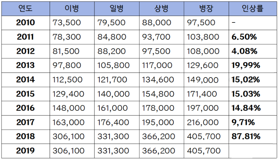 2010년부터 2019년 까지 군인 월급 인상율 입니다. 최근인 2018년도에서 2019년에 넘어갈 당시 87.81%라는 어마어마한 이상률을 확인하실 수 있습니다.